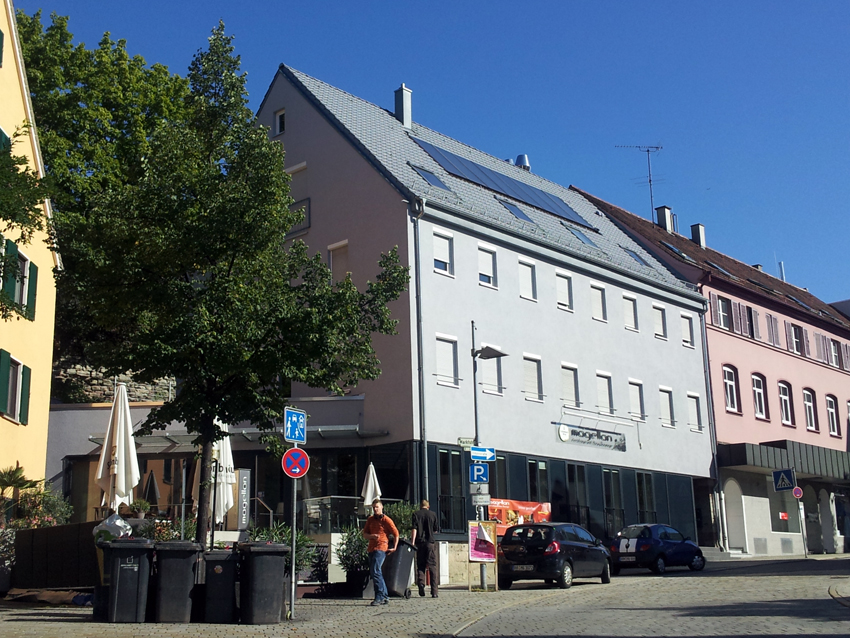 Umbau und energetische Sanierung eines Wohn- und Geschäftshauses. Erneuerung der Gebäudehülle und Heizungsunterstützung durch Solarthermie.